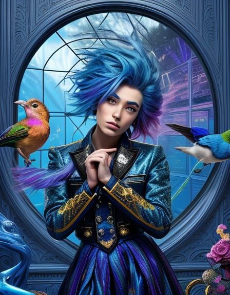 This hyperrealistic image shows an androgynous person styling their hair in a grand, modern, magical room. A glowing bird flies through the window as a blue cat rests nearby.