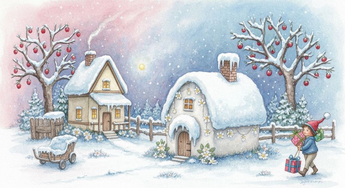A charming winter scene featuring a fluffy white squirrel adorned with frost and tiny blossoms. It's surrounded by festive foliage near a cozy cottage, rendered in a soft, pastel watercolor style.
