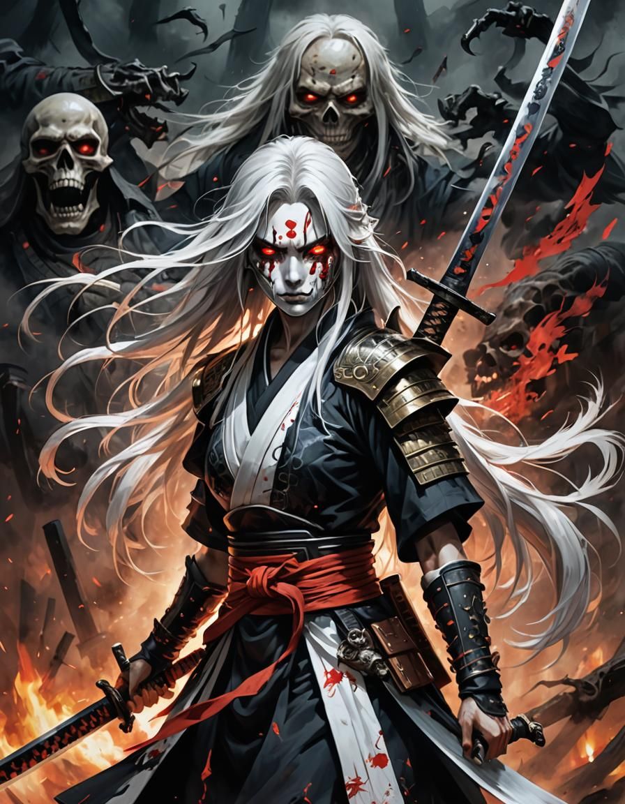 A digital painting of an angry samurai woman with long white hair and red eyes, holding a sword and covered in bandages. The dark fantasy illustration features a hyperdetailed scene with skulls and smoke.