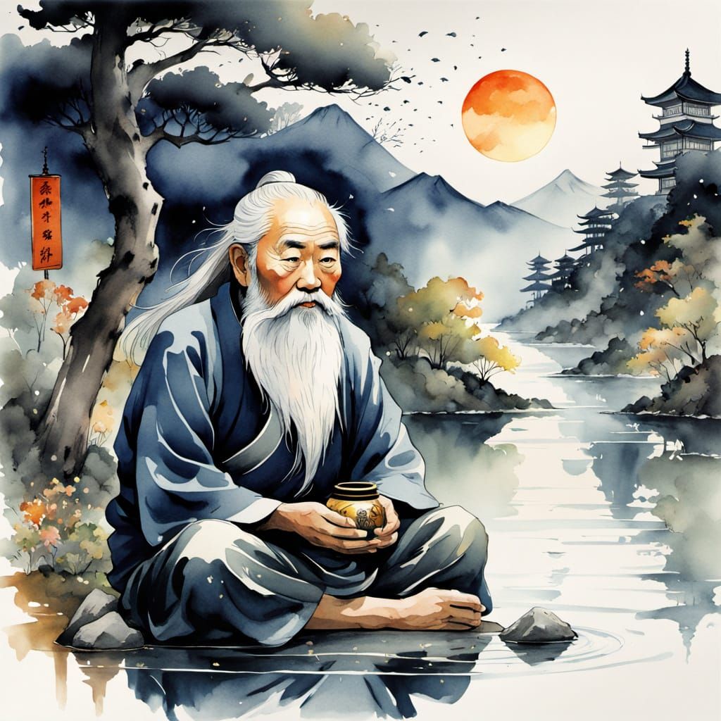 This image shows a bearded wise man meditating by a lake at night, holding a lantern. The scene is rendered in a fine-tuned watercolor style with Japanese ink elements, creating a peaceful and harmonious ambiance.