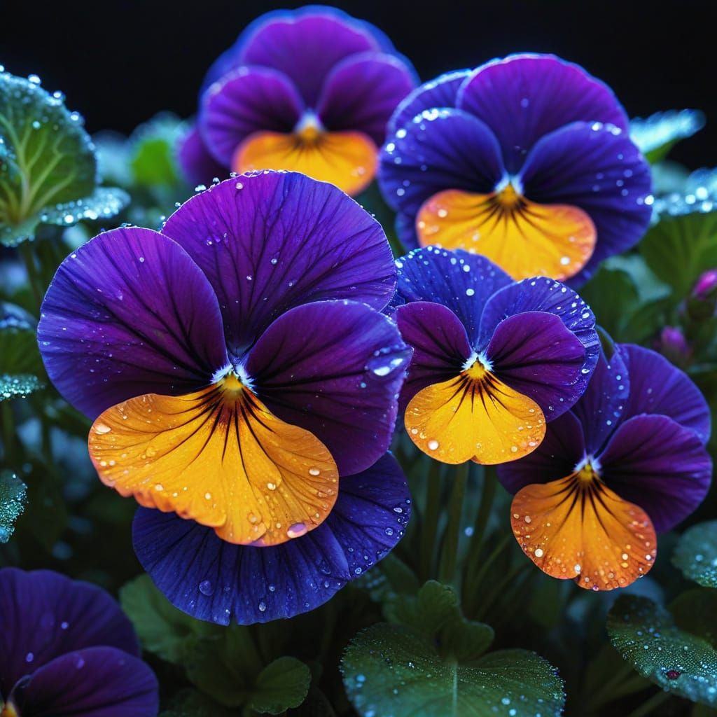 This image showcases vibrant Viola tricolor pansies in macro detail, featuring ovate-lanceolate leaves. Rendered in a synthwave aesthetic with neon colors and bokeh, it highlights intricate petal textures and dewdrops.