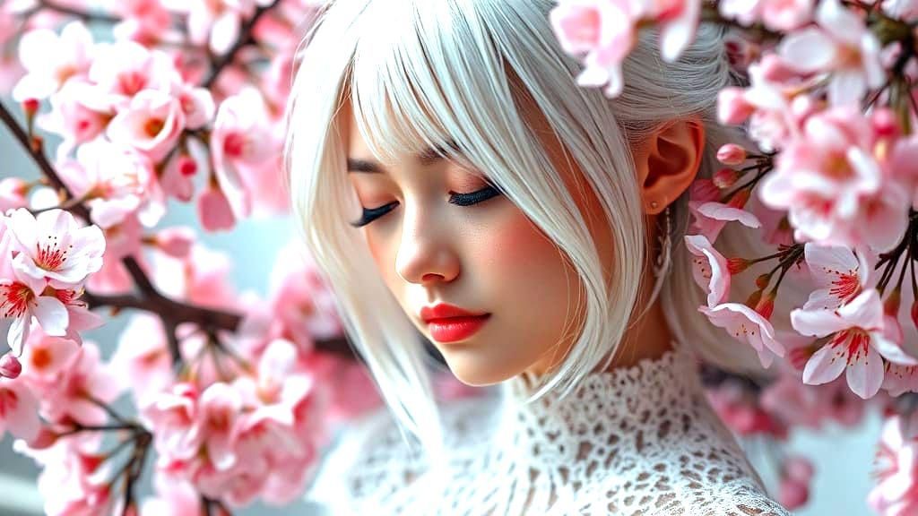 A captivating image of an ethereal woman with silver hair surrounded by cherry blossoms. This hyperrealistic image features soft lighting and intricate details, in a fantasy-inspired style.
