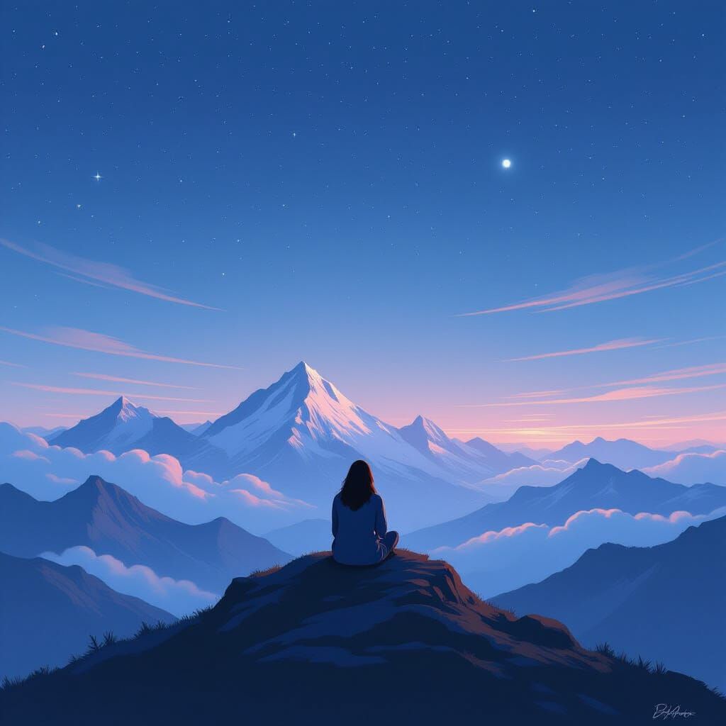 This image shows a solitary woman on a mountain peak, observing a tranquil, star-filled night sky. Rendered in a soft, impressionistic digital painting style with visible brushstrokes and a muted palette.