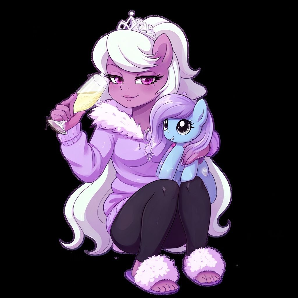 This image shows a grown-up Diamond Tiara from My Little Pony in an opulent setting. She sips champagne with a spoilt expression, in a vibrant anime manga style.