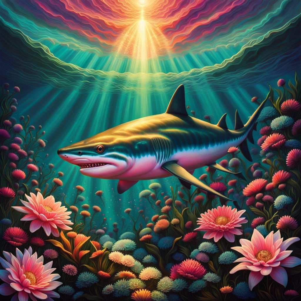 This image showcases a majestic salmon shark set amidst a vibrant, dreamlike environment with intricate airbrush art details and a mesmerizing array of spirit lights, flowers, and jewels, all infused with a sense of otherworldly wonder and a touch of psychedelic flair.