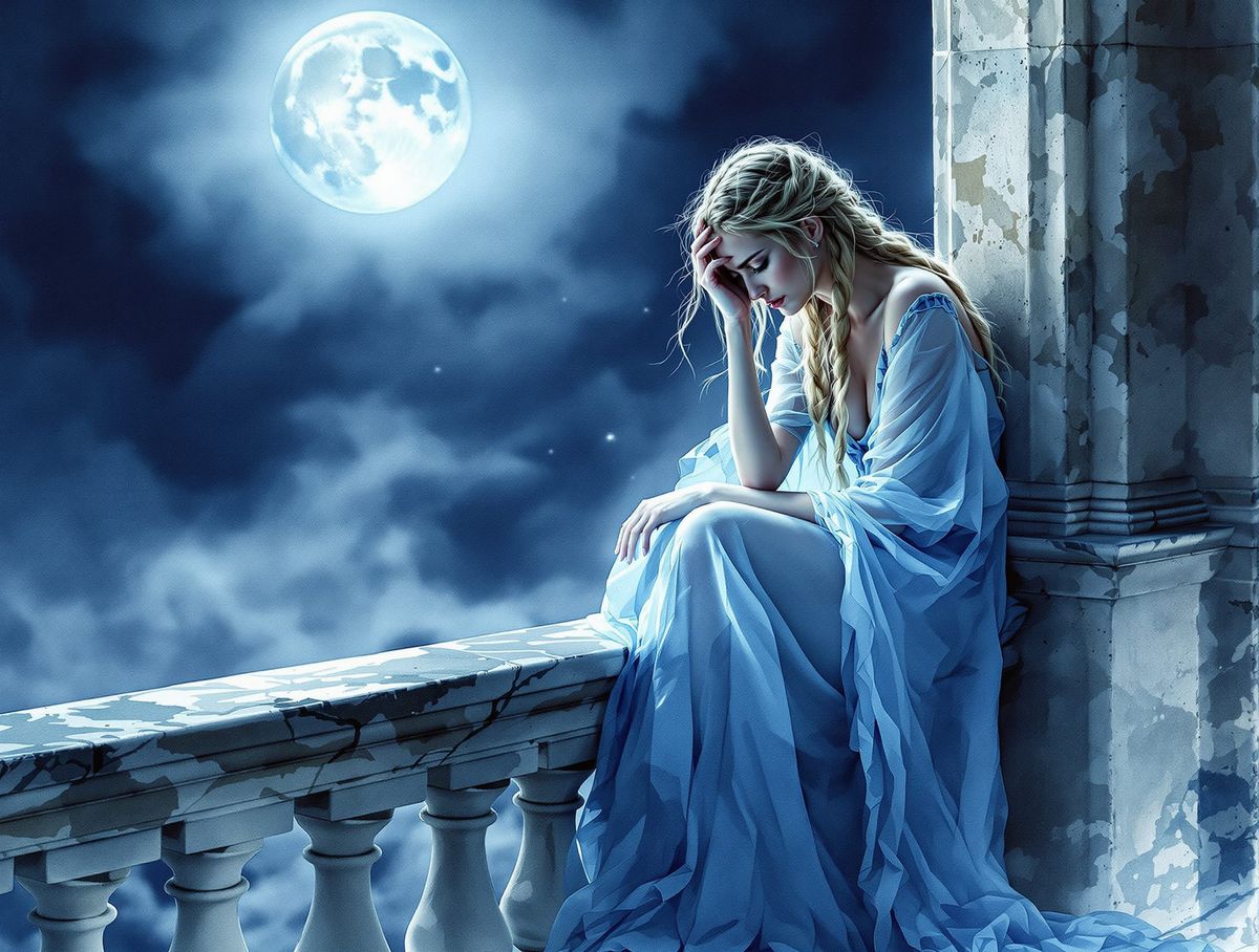 This image shows a beautiful Norse goddess with braided blonde hair, seated sadly on a marble railing, dressed in a light blue gown. The scene is set on an old balcony, bathed in moonlight and surrounded by mist, with ink splatter and watercolor effects.