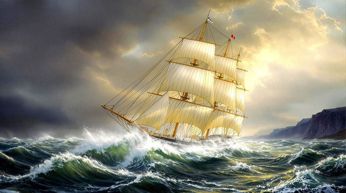 An oil painting in the style of 1890, depicting the majestic Norwegian full-rigged tall ship, Christian Radich, battling...