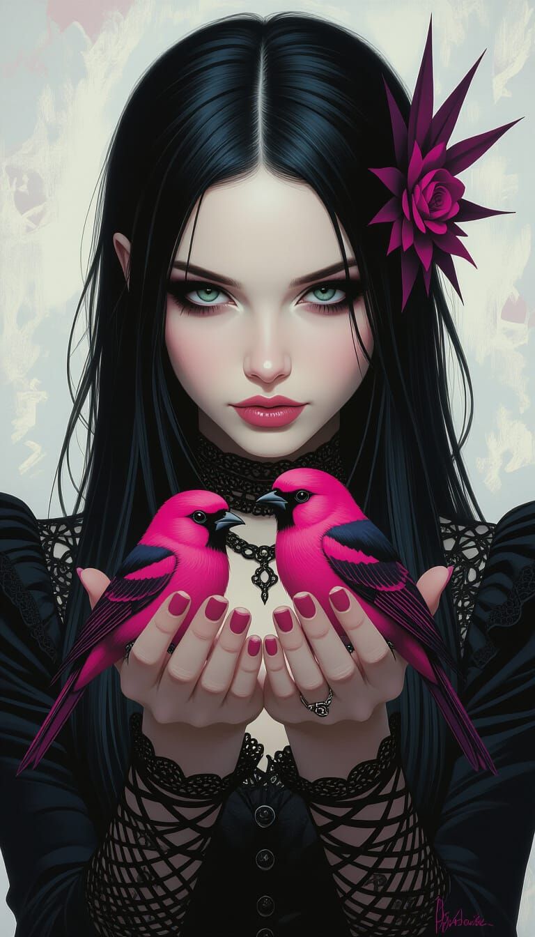 This image shows a detailed, painterly depiction of a young goth woman with punk influences, tenderly holding a small pink bird. The scene features subtle lighting and surreal, intricate textures.