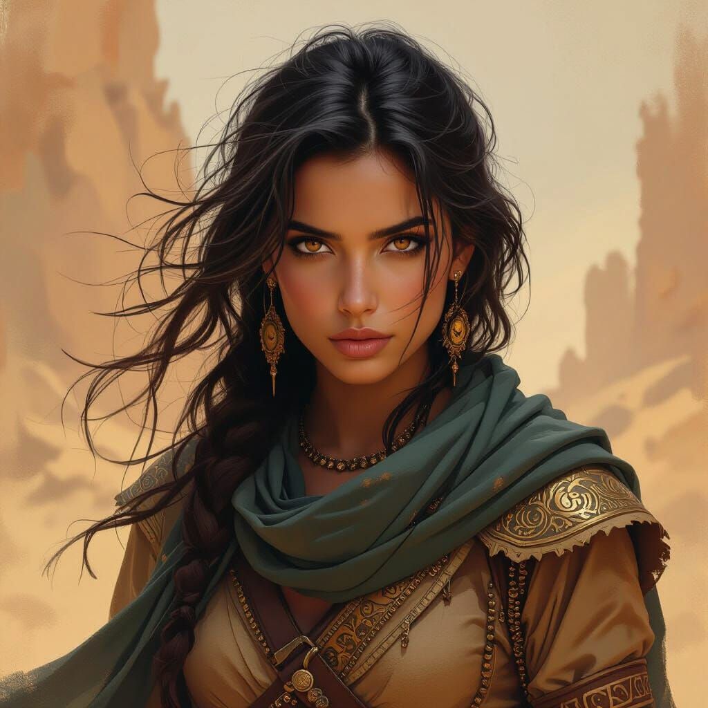 This digital painting features a detailed portrait of a female desert warrior noble with intense amber eyes and windswept hair. The artwork showcases expressive impasto brushwork and dynamic lighting.