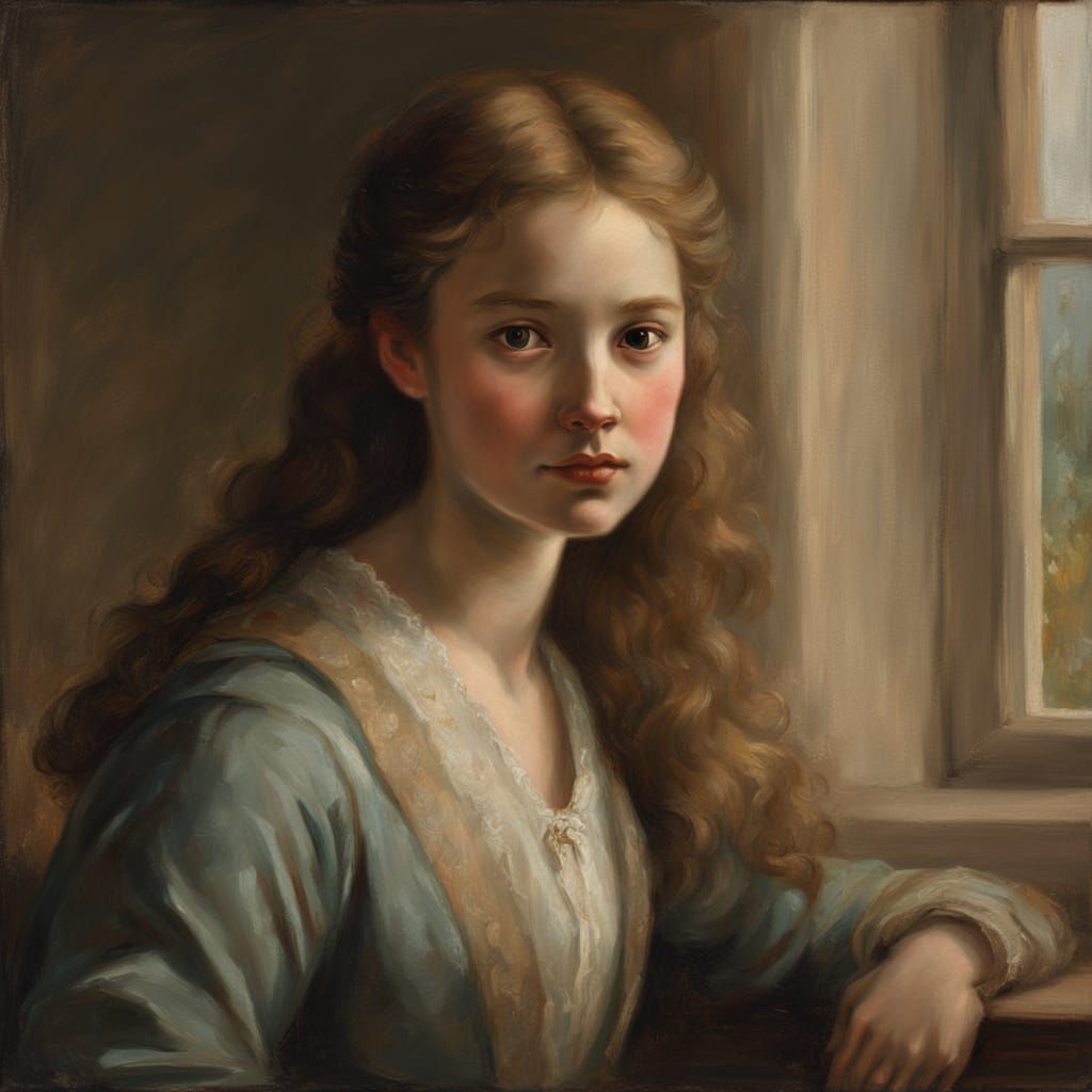 This image is an oil painting portrait of a young woman with fair skin and rosy cheeks. It features atmospheric lighting and subtle details, evoking classic 18th-century fine art.