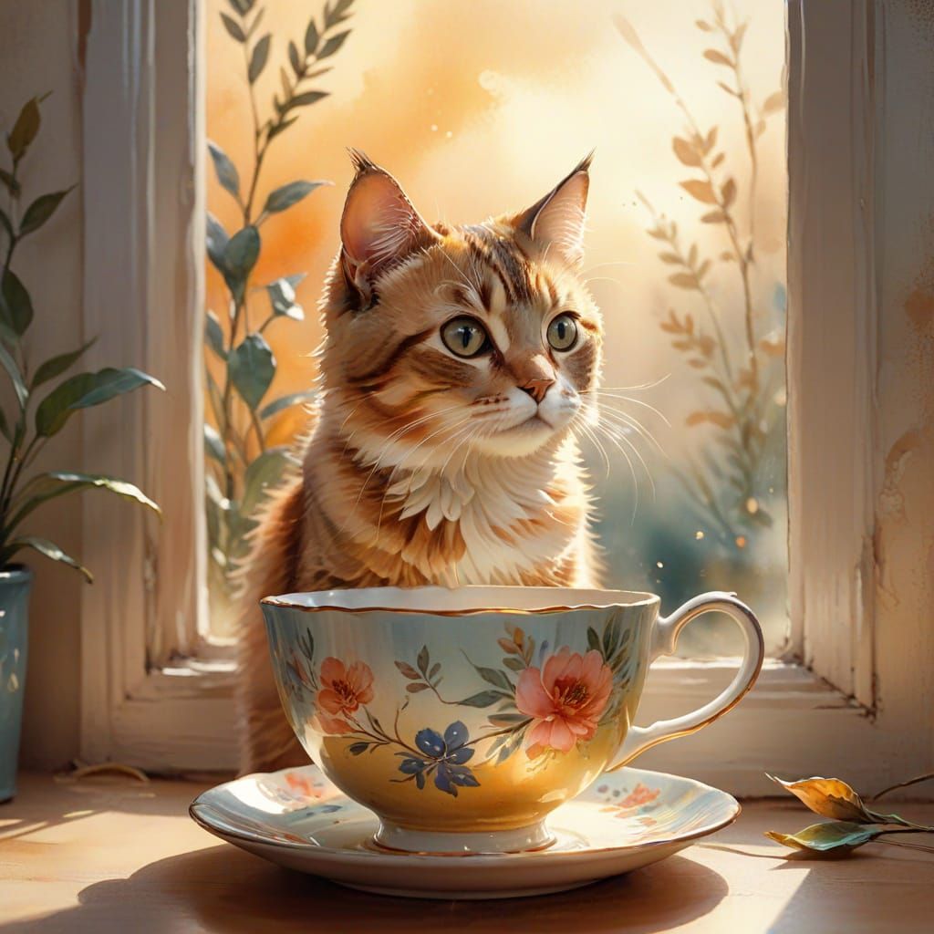 This enchanting watercolor painting captures a curious cat peeking out from a delicate china cup, surrounded by warm, golden light and soft, blended brush strokes, transporting viewers to a dreamy, fantastical world reminiscent of classic children's illustrations.