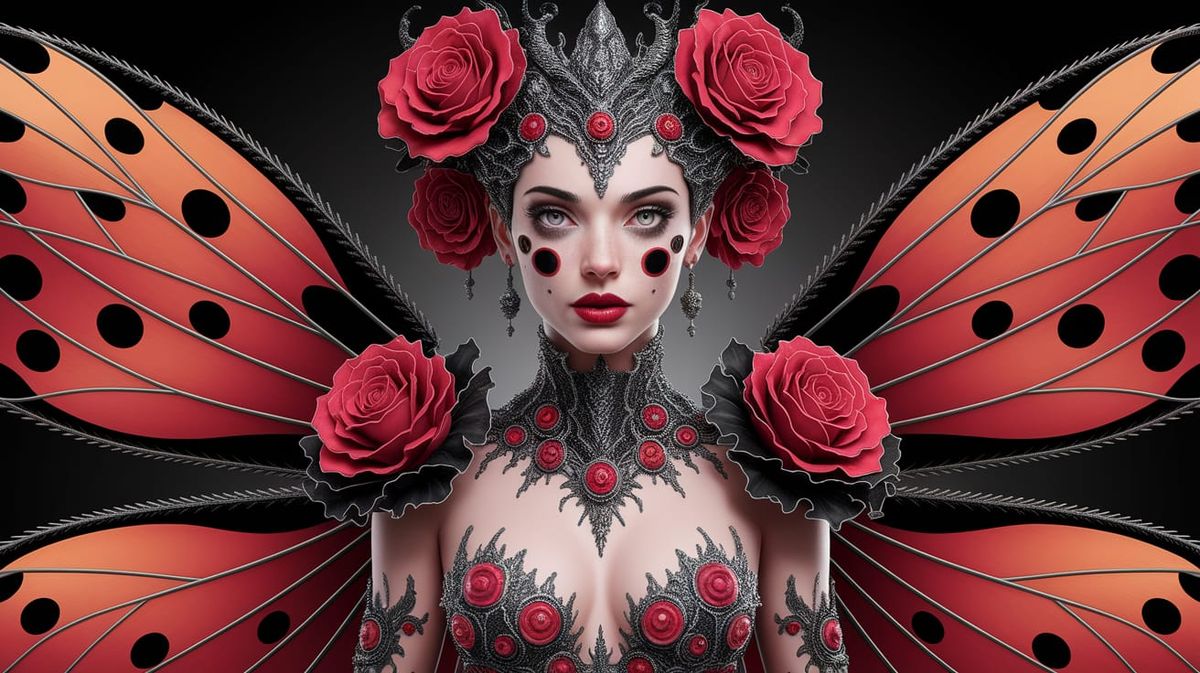 A hyperrealistic portrait of a queen of ladybugs with intricate winged dress and striking features, set against a backdrop of roses and eldritch magic.