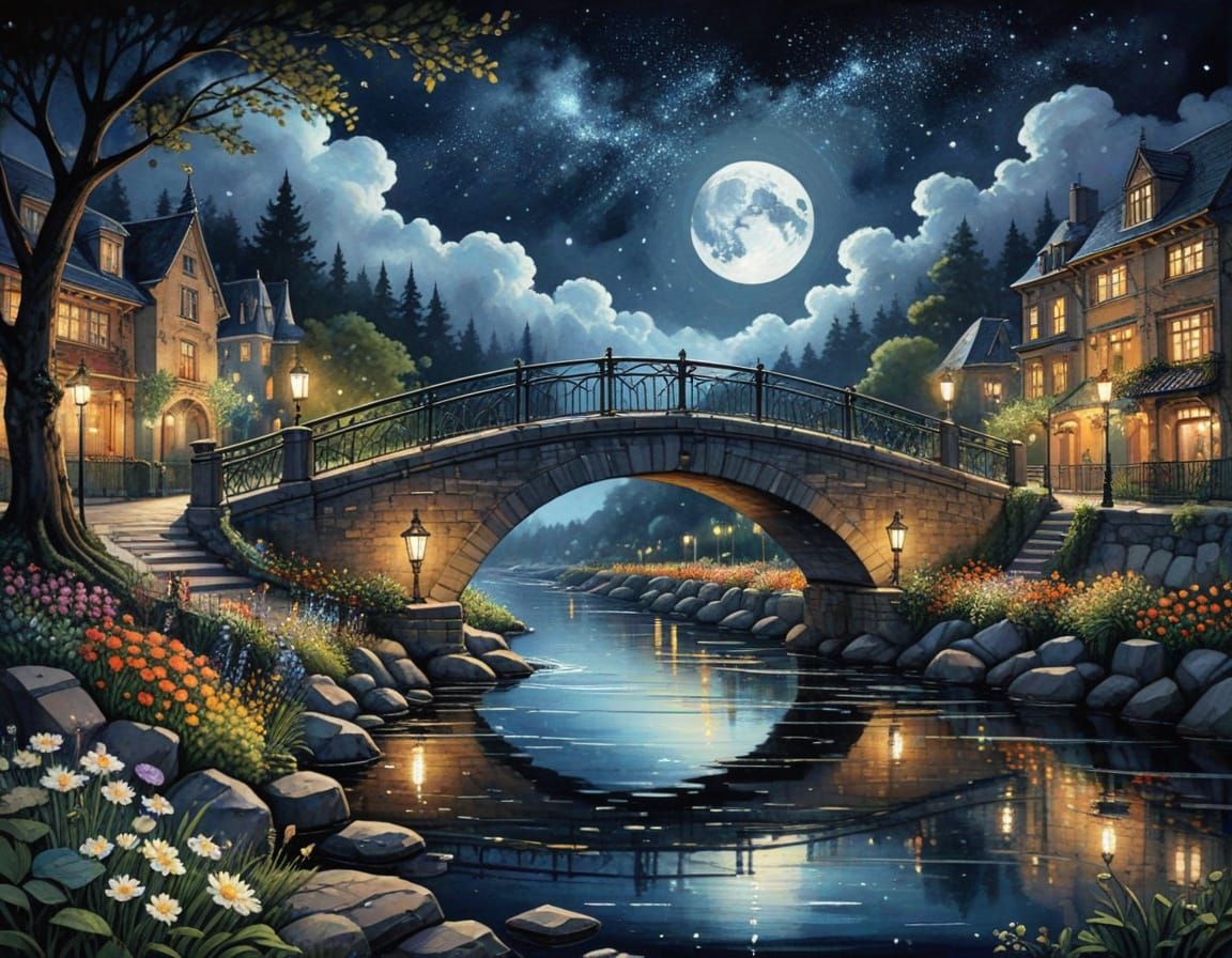 A sweeping stone bridge crossing a river, illuminated by glowing streetlights and starlight, with a charming, intricate design in a fantasy art style