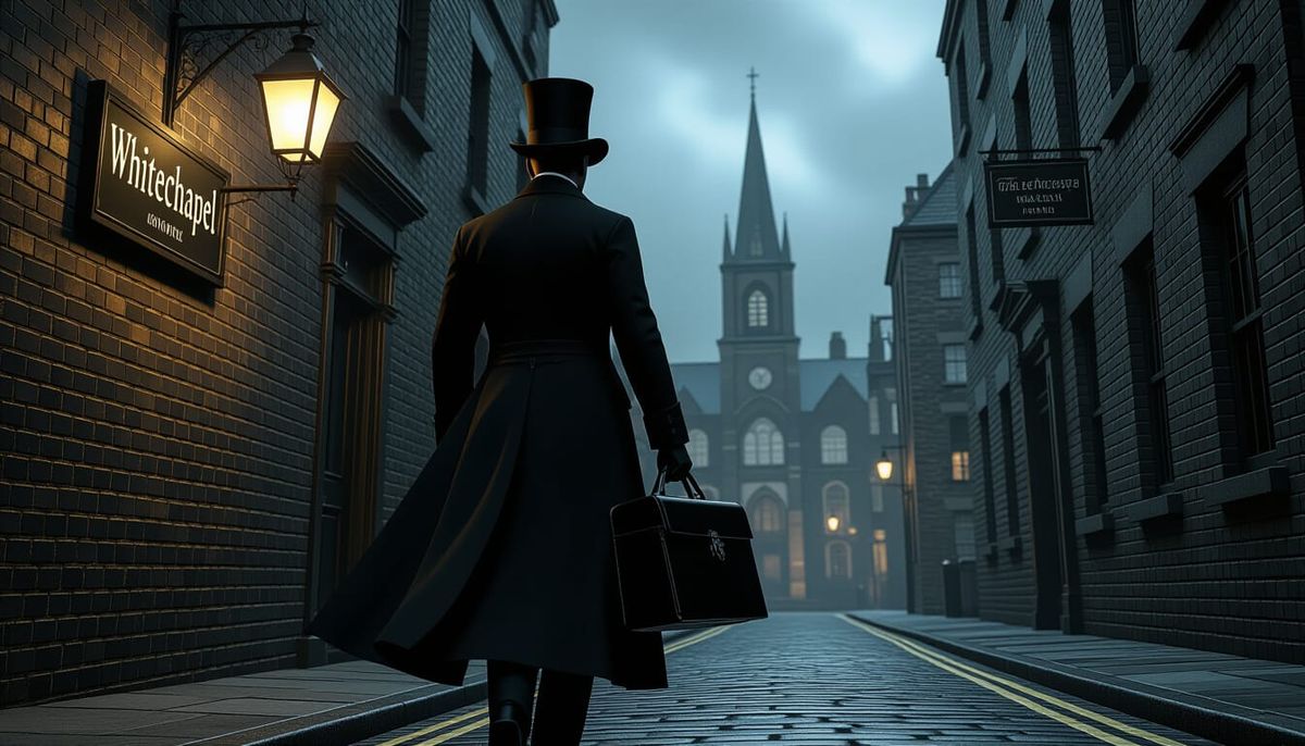 This image shows a tall Victorian man in a black suit and hat, carrying a medical bag down a dimly lit street. The gothic scene features cinematic lighting and a high-contrast concept art style.