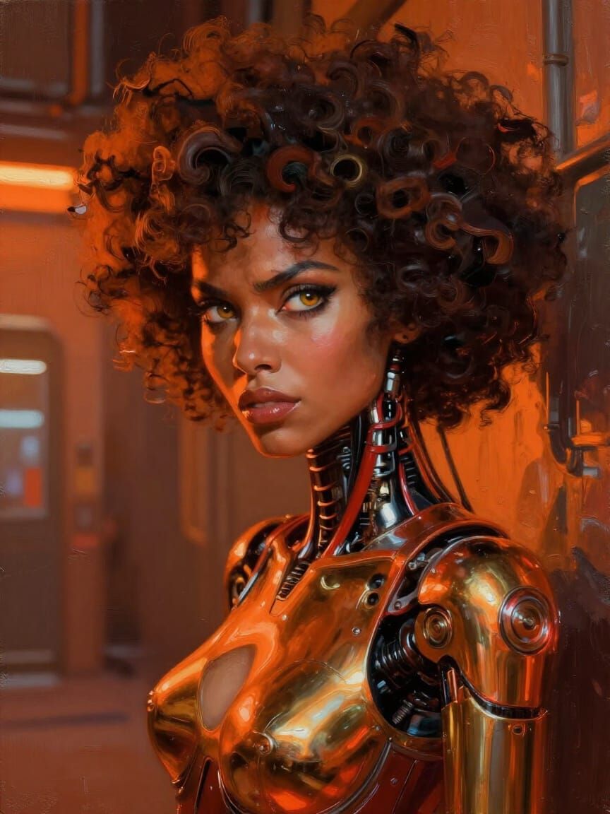 Solar Vintageworks, orange amber rust sandstone clay burnt_umber, Spectrum Studio, Retro-Futurism extreme close-up 3/4 portrait of a shiny brass afro-latino android woman looking mildly annoyed yet seductive with large glowing eyes, wry lop-sided grin, visible wires, vermilion_chrome plating, in a futuristic ...