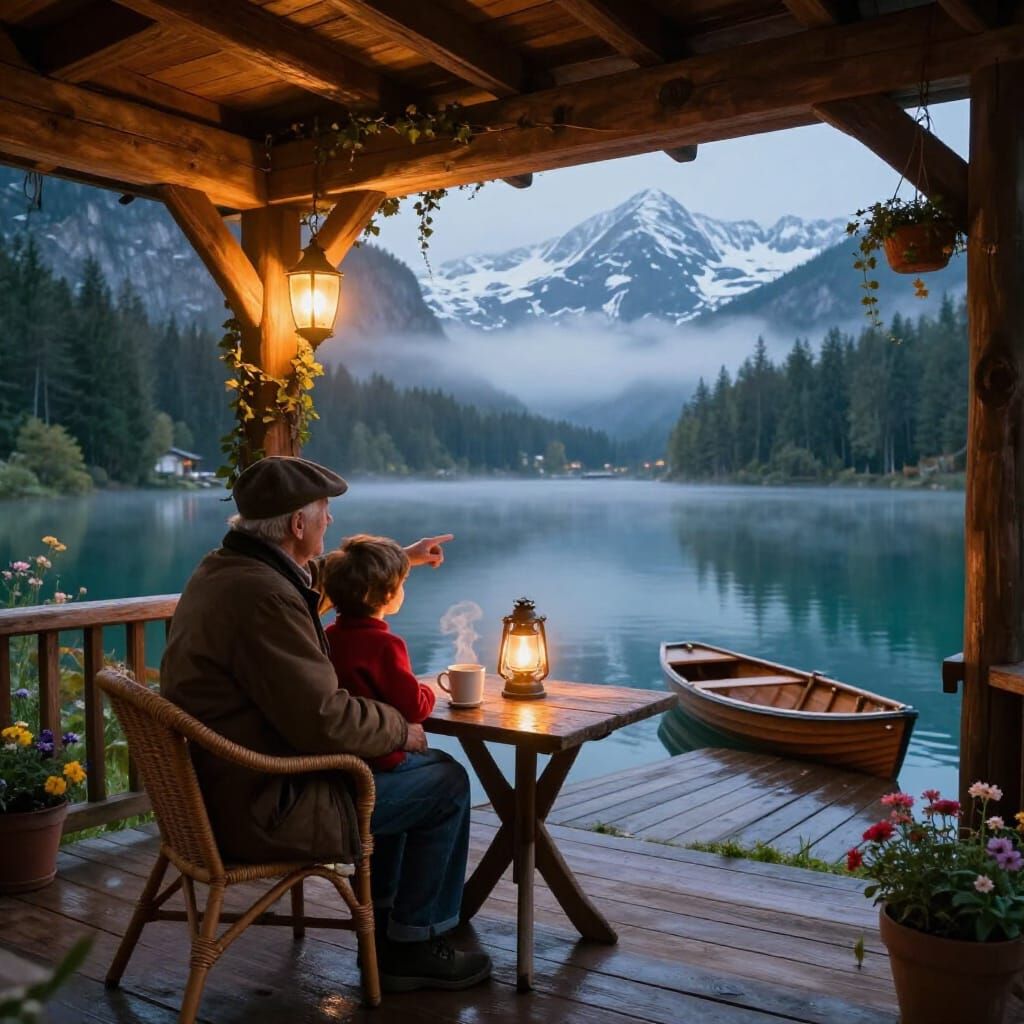 This image shows a heartwarming scene of a grandfather and grandson on a cozy wooden porch overlooking a misty mountain lake at dawn. The hyper-realistic digital art captures a magical, nostalgic atmosphere with cinematic lighting.
