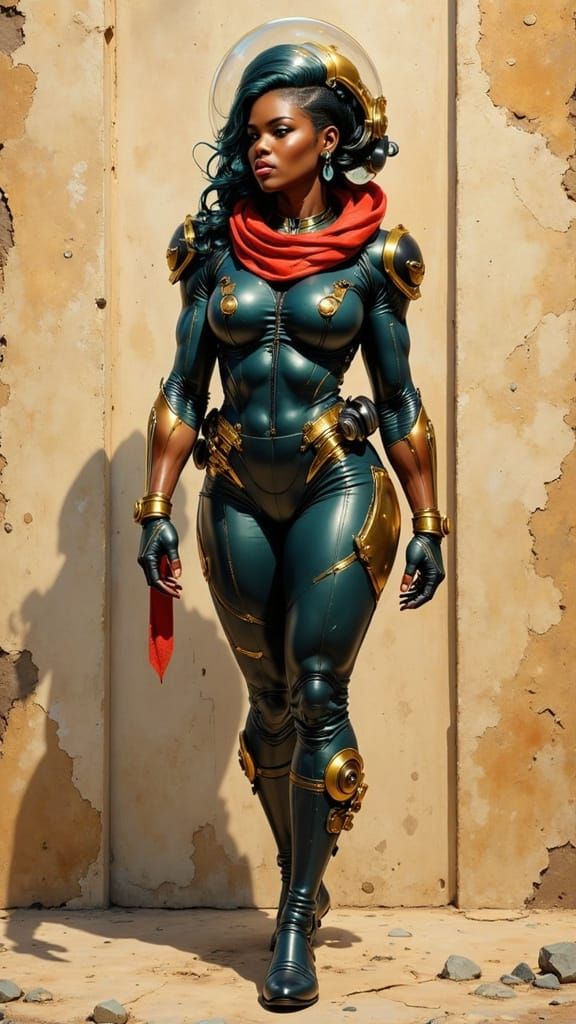 This image shows a full-body portrait of a muscular, voluptuous Black woman in a retro-futuristic military spacesuit. She has vintage curls, glamorous makeup, and stands against a textured beige canvas in an ultra-realistic style.