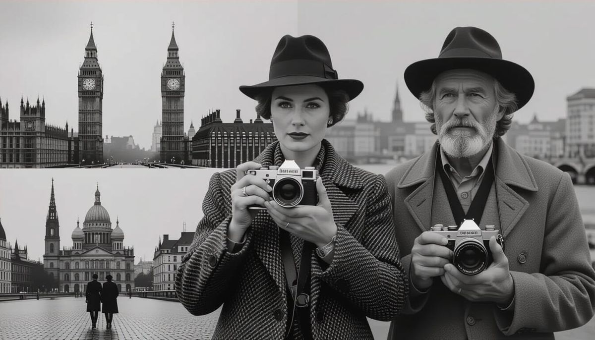 A captivating image showcasing the evolution of photography. A vintage photographer transforms into a modern counterpart against a backdrop of historical events in mixed color styles. A timeless portrayal of photographic progress.