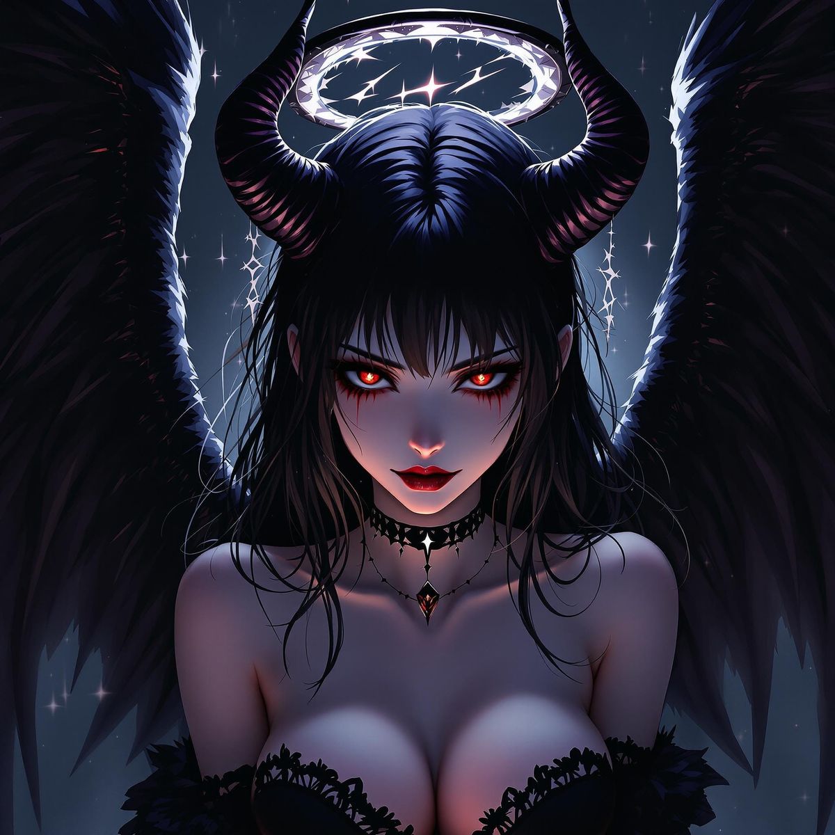 This striking anime image features a fallen angel with pale skin, dark eyes, and beautiful demon wings. The dramatic digital painting is done in a cel-shaded style with deep colors and a flat aesthetic, reminiscent of Studio Trigger's unique visual flair.