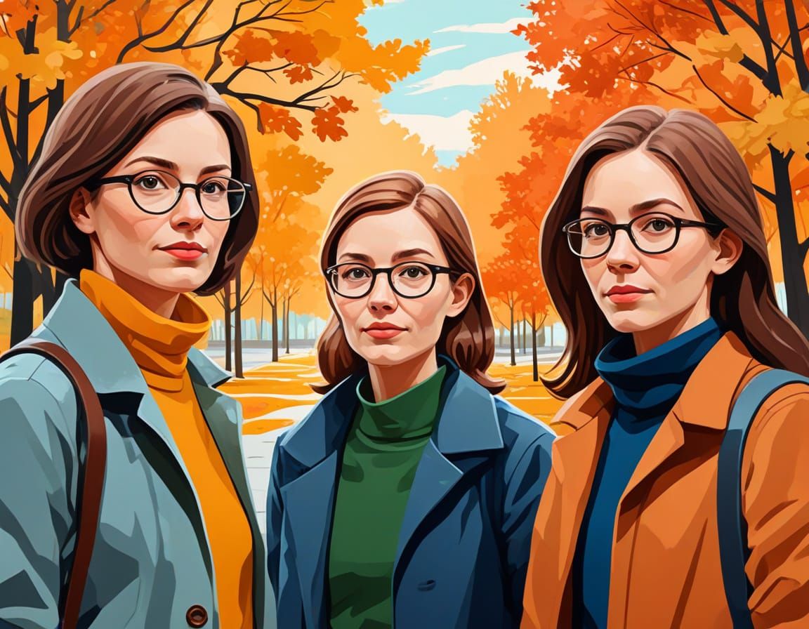 This image depicts university teachers engaged in a philosophical discussion about art, set against an autumn landscape. It features a harmonic composition in a flat, modernist illustration style with abstract, complementary colors.