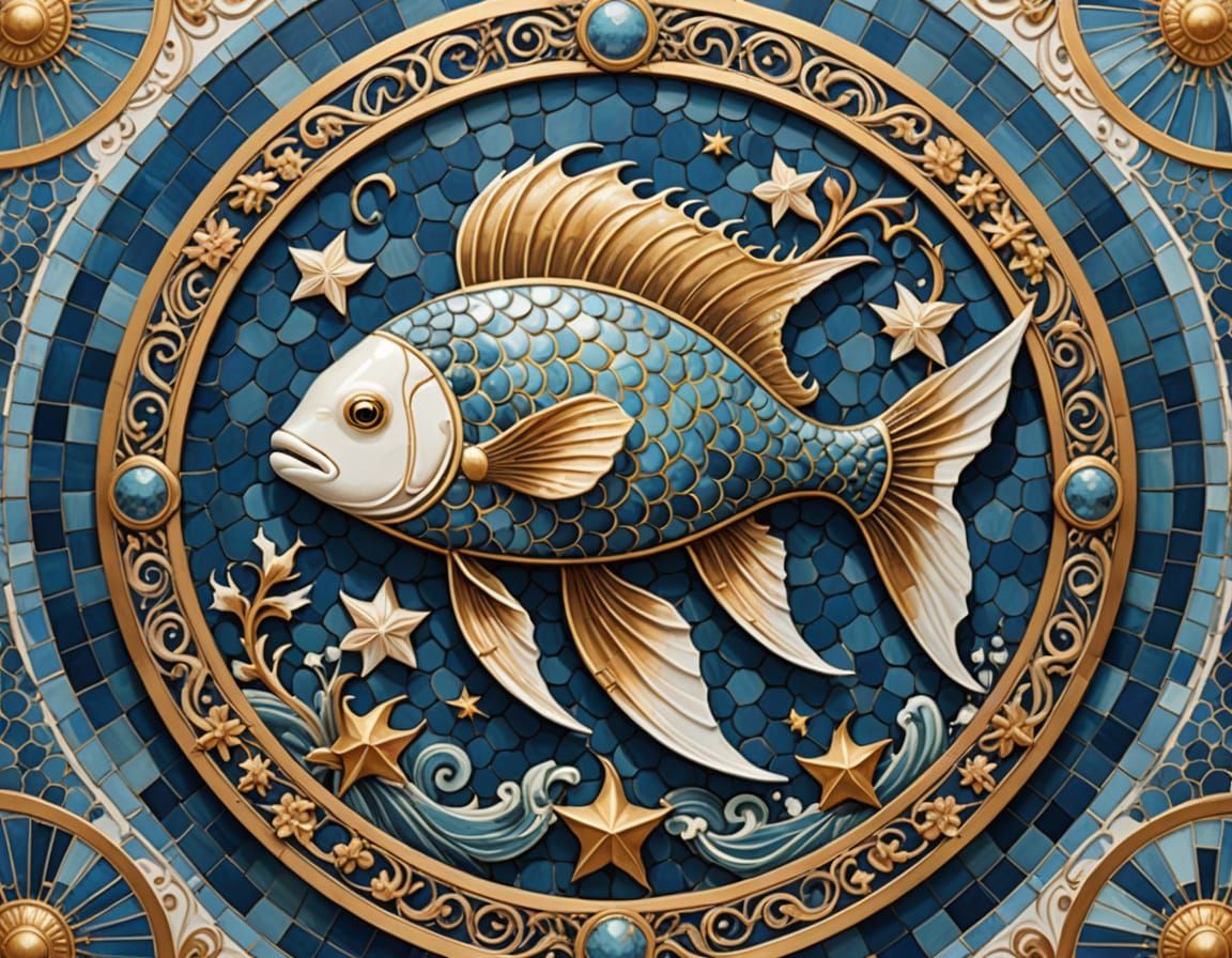 This image shows a stunning mosaic artwork in the style of Ancient Greece, featuring the Pisces zodiac symbol against a wave-patterned ocean floor, with intricate tilework and shimmering golden accents.