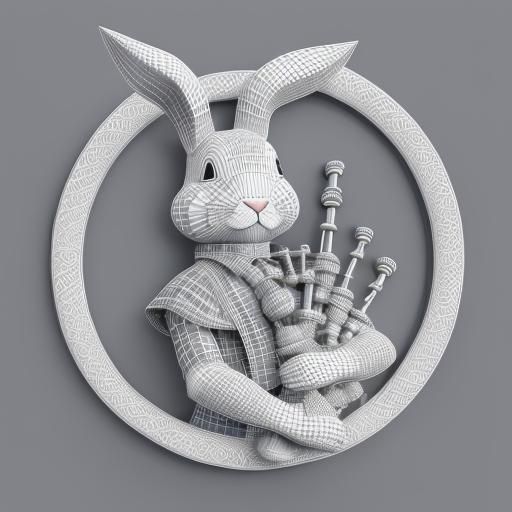 This image depicts a rabbit playing bagpipes in a Scottish style, rendered with abstract vector fractal techniques and 3D shading.