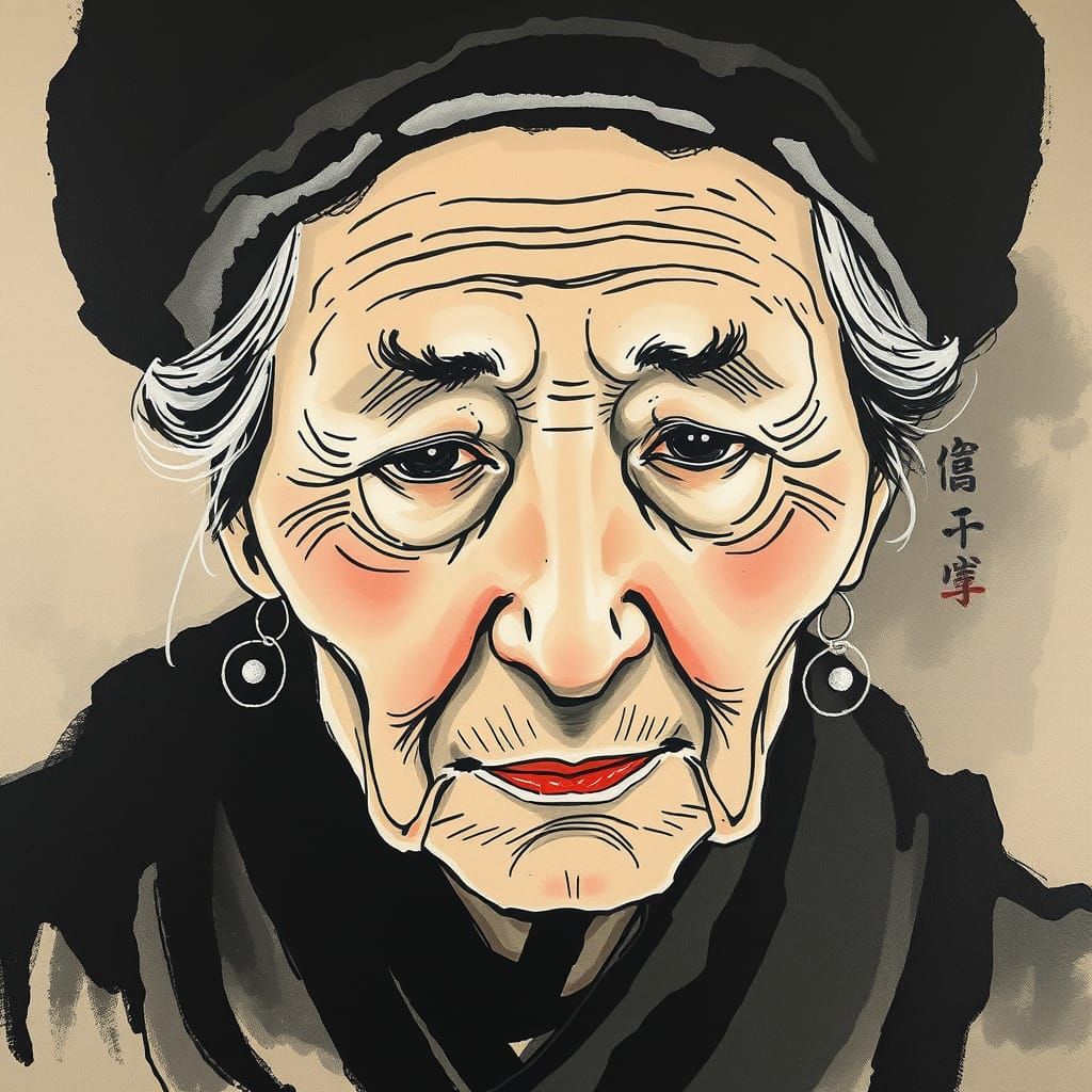 This image depicts a serene Korean elderly woman, rendered in the style of traditional Chinese ink painting on a matte background with subtle oil on canvas textures, evoking a sense of timeless tranquility.