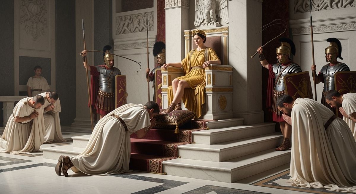 This image shows Empress Messalina on her throne in a Roman palace hall. Senators in togas kneel before her as legionnaires stand guard in this naturally lit scene with intricate marble and gold details.