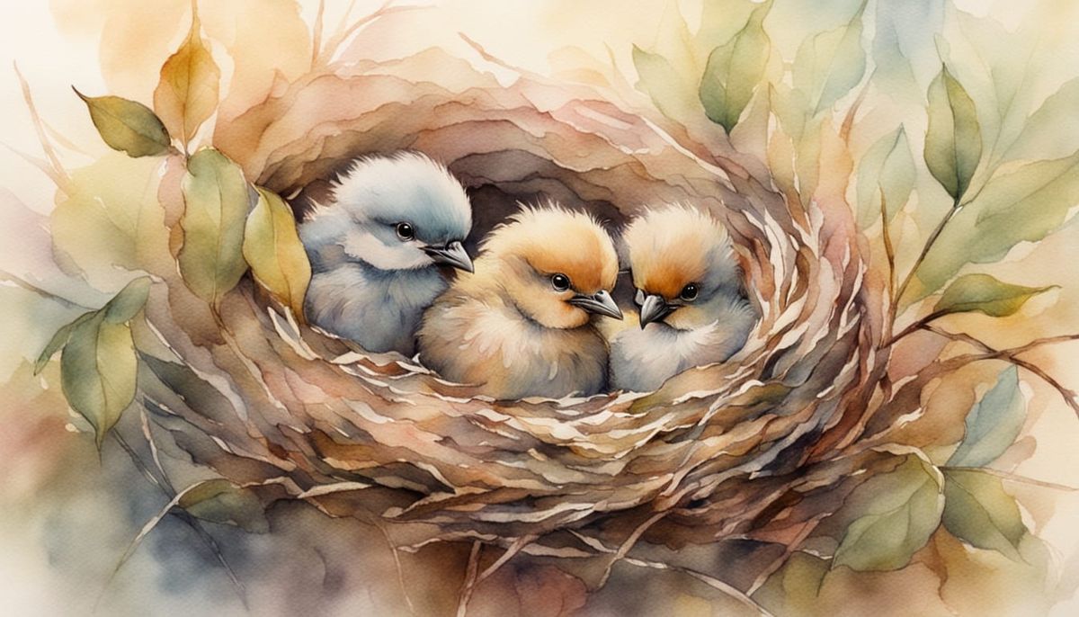 A close-up watercolour of baby birds in a nest. The macro photograph showcases soft feather textures and warm earthy tones in a dreamy, serene, and whimsical style.