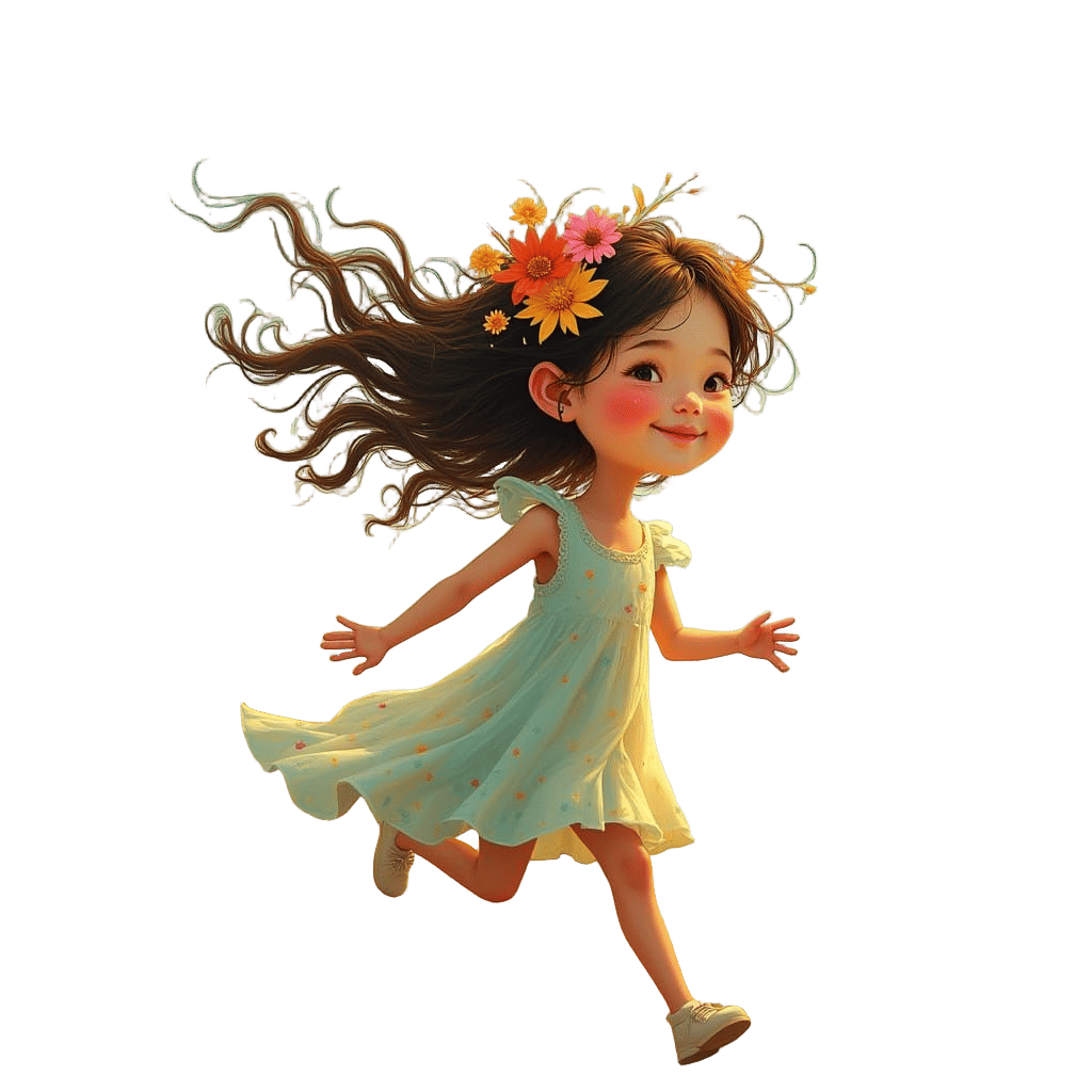 A young girl runs through a lush field of tall flowers on a sunny day, her colorful hair adorned with flowers and surrounded by a whimsical aura, evoking the dreamy worlds of Japanese animation and folk art.