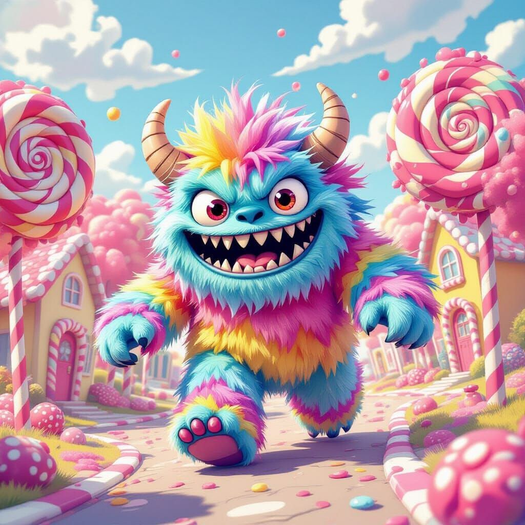 This image shows a pastel pom-pom monster gleefully rampaging through a candy land. The whimsical scene features lollipop trees and gumdrop houses in a bold, vibrant style.