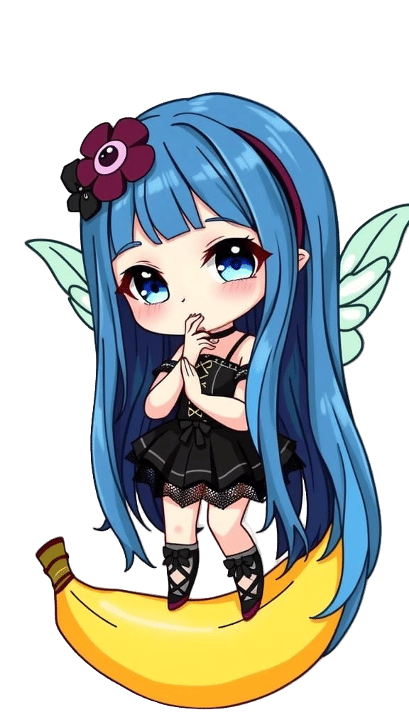 adorable gothic-hippie chibi fairy with long blue hair. adorable gothic-hippie chibi banana