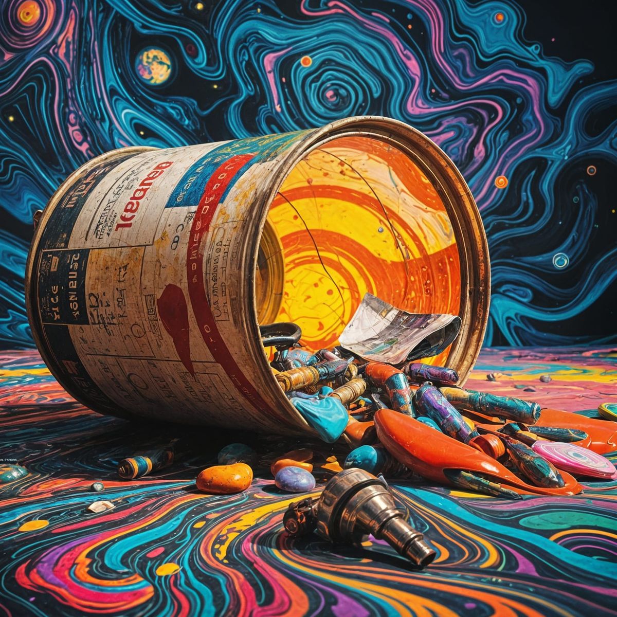Old paint can filled with memories, tipped over, spilling out vibrant colors, nostalgic psychedelic surrealism, reminiscent of Salvador Dali's dreamlike scenery, Ash Thorp's neon-lit futurism, and Android Jones's vibrant, swirling patterns.