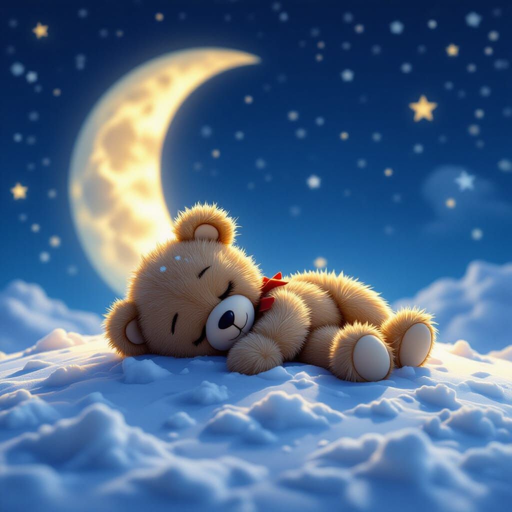 This image shows a whimsical, surreal concept art of a teddy boy sleeping on the moon. Stars and snowflakes fill the night sky, with soft lighting and vibrant colors, resembling an oil painting.