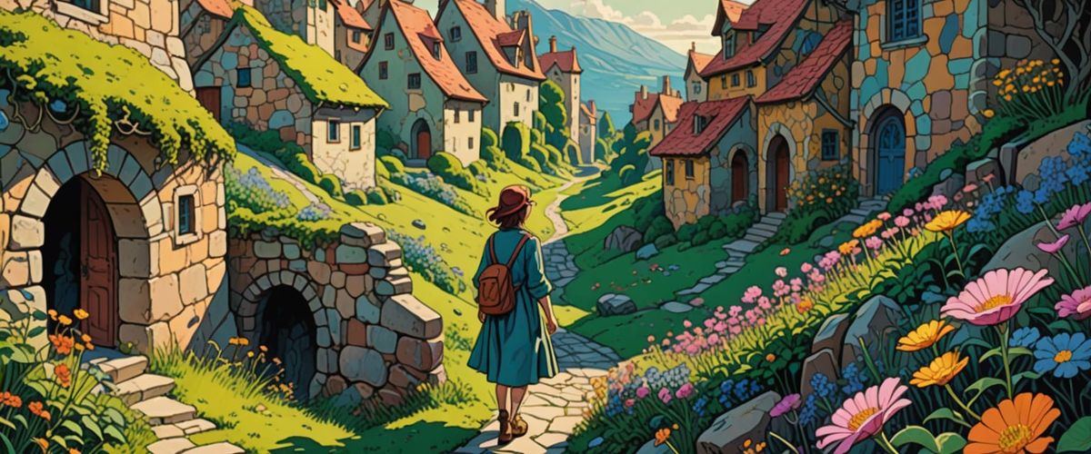 This image shows a cheerful girl walking through stone walls in sunlight. The scene has a comic book aesthetic with vibrant colors and whimsical, fantasy-inspired details reminiscent of Ghibli.