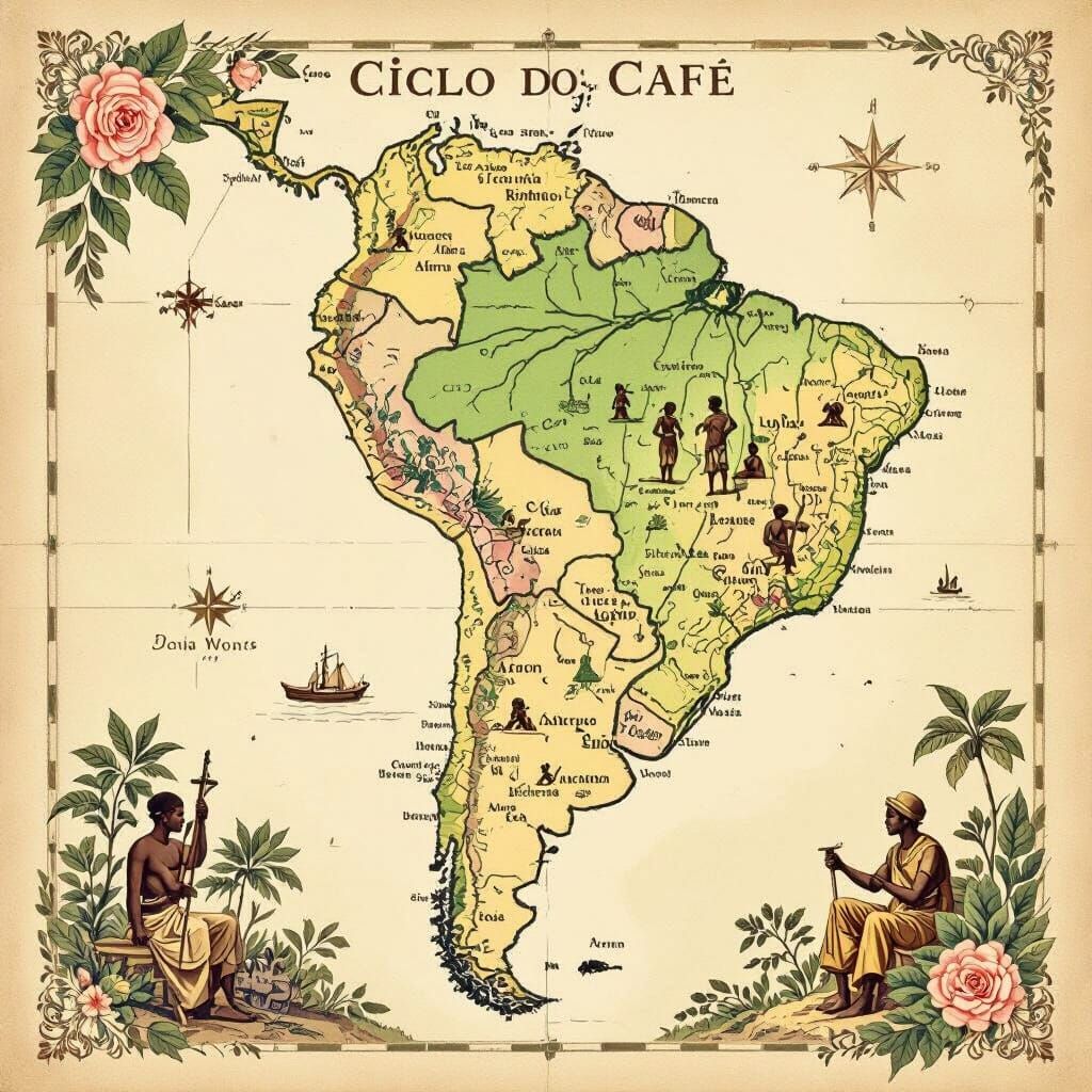 This image shows a vintage-style illustrated map of Brazil during the Coffee Cycle. The artwork depicts symbolic scenes connected by flowing paths, rendered in soft beige, green, and sepia tones with aged textures.