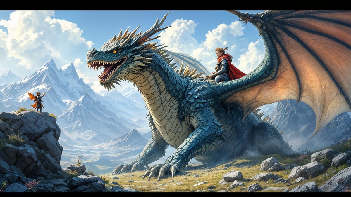 A majestic dragon, the size of a house, carries a young ranger through a mountain landscape. Both wear medieval armor in this fantasy image with bold lines and bright colors.