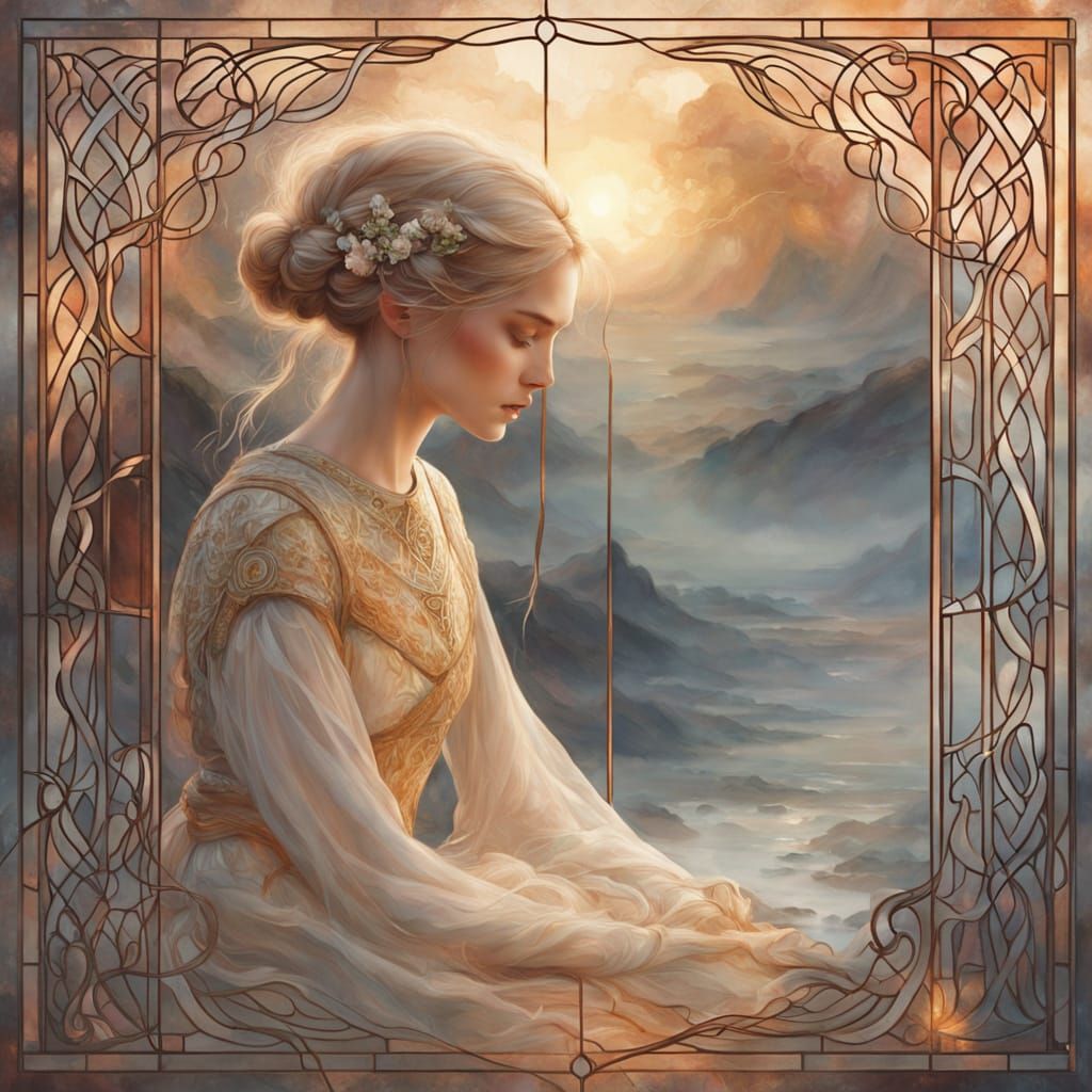 This image depicts a serene scene of women in Celtic attire praying and watching from the sidelines as a battle rages in the distance. The soft, ethereal light shining through the stained glass creates a warm, dreamy atmosphere with intricate Celtic knotwork patterns and elegant, flowing lines.