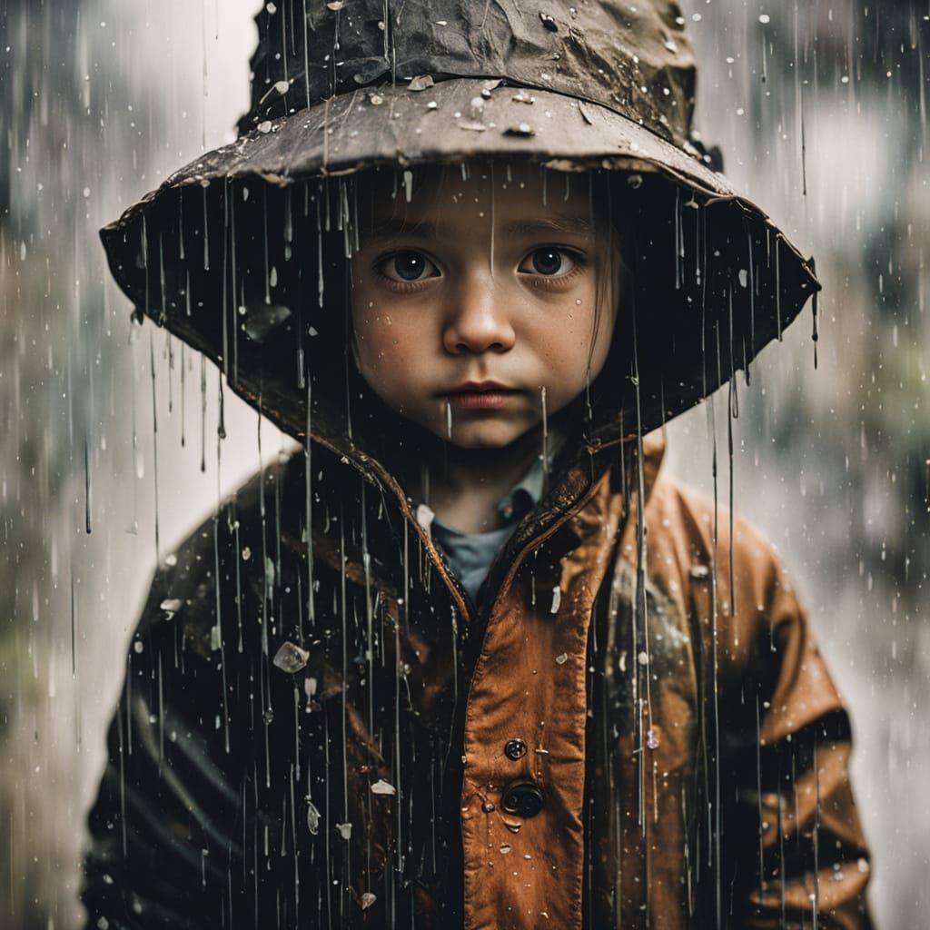 A poignant portrait of a girl holding a vinyl record. The image evokes the styles of several illustrators, depicting a child in ragged clothes hiding her tears in the rain.