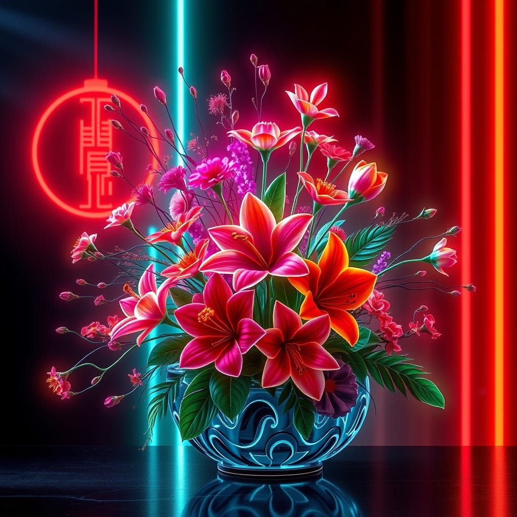 This image showcases spectacular Chinese floral ikebana art, featuring a balanced arrangement symbolizing nature's essence. Rendered in a synthwave neon retro style with dynamic lighting and vivid color gradients.