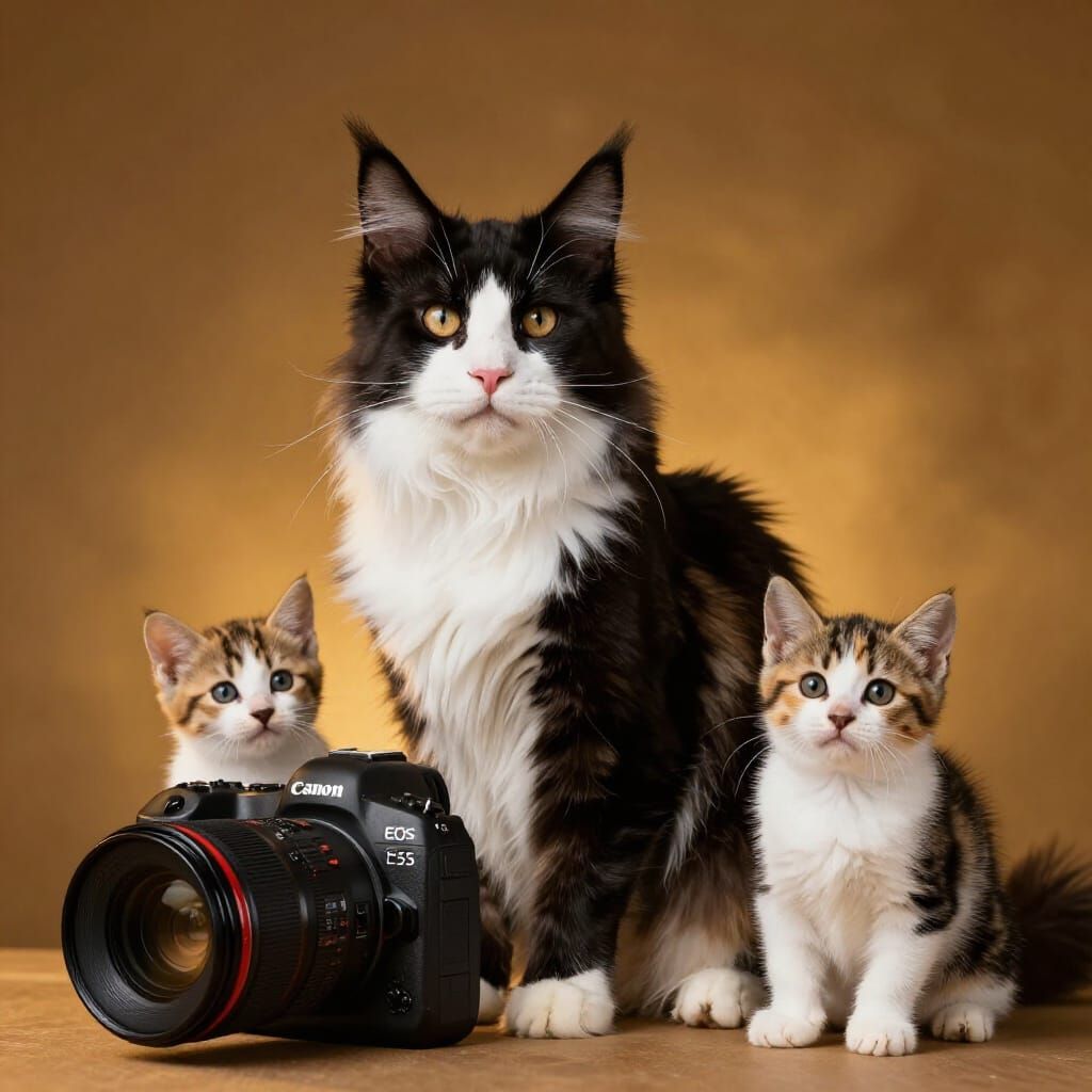 This photorealistic image showcases a black and white bicolor Maine Coon cat with her kittens, captured with studio lighting and a shallow depth of field. The golden hour lighting adds a warm, cinematic feel.