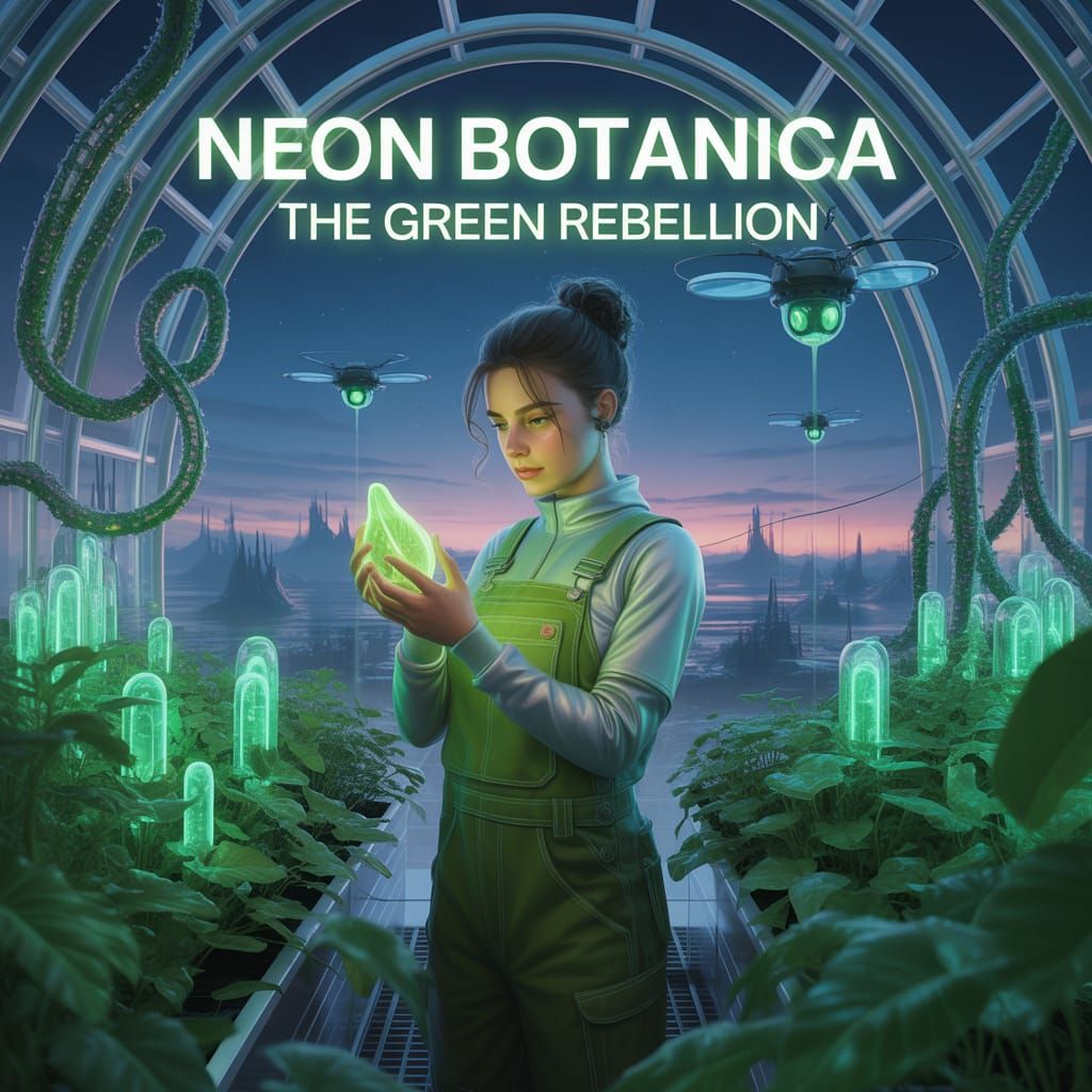 A digital illustration of a rebel eco-hacker in futuristic attire within a glowing greenhouse, examining a seed pod. Features towering glass roots, a floating city, and neon lighting.