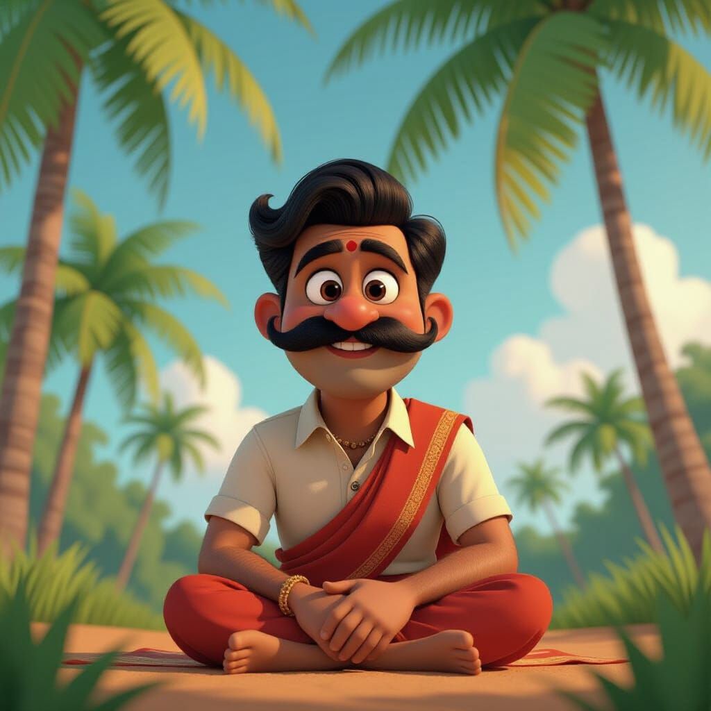 This image showcases a 3D cartoon character of a South Indian villager with a big mustache and funny expression, sitting under coconut trees. Rendered in a vibrant, cinematic Pixar-inspired style.