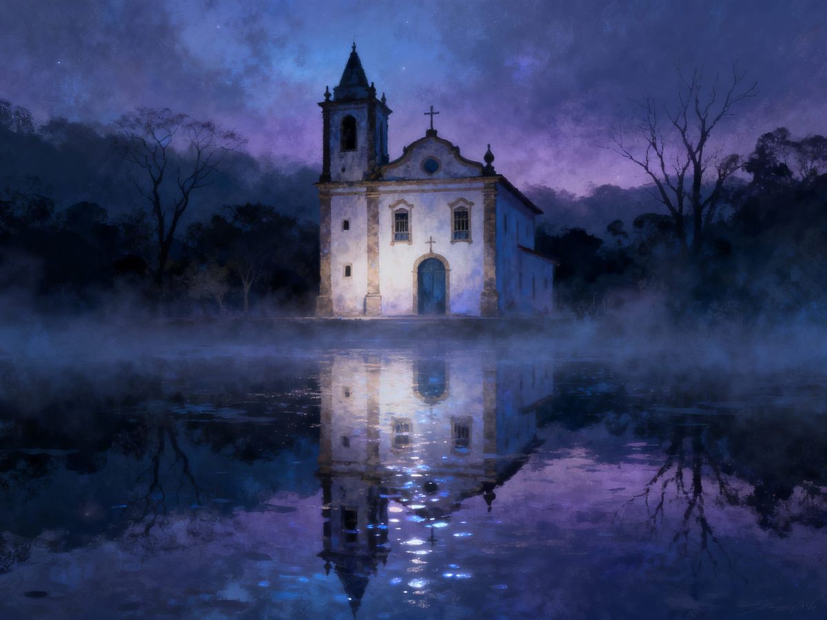 This dreamshape art painting depicts a mysterious chapel in Paraty, Brazil, reflecting in surrounding water under a misty night sky with bare trees.