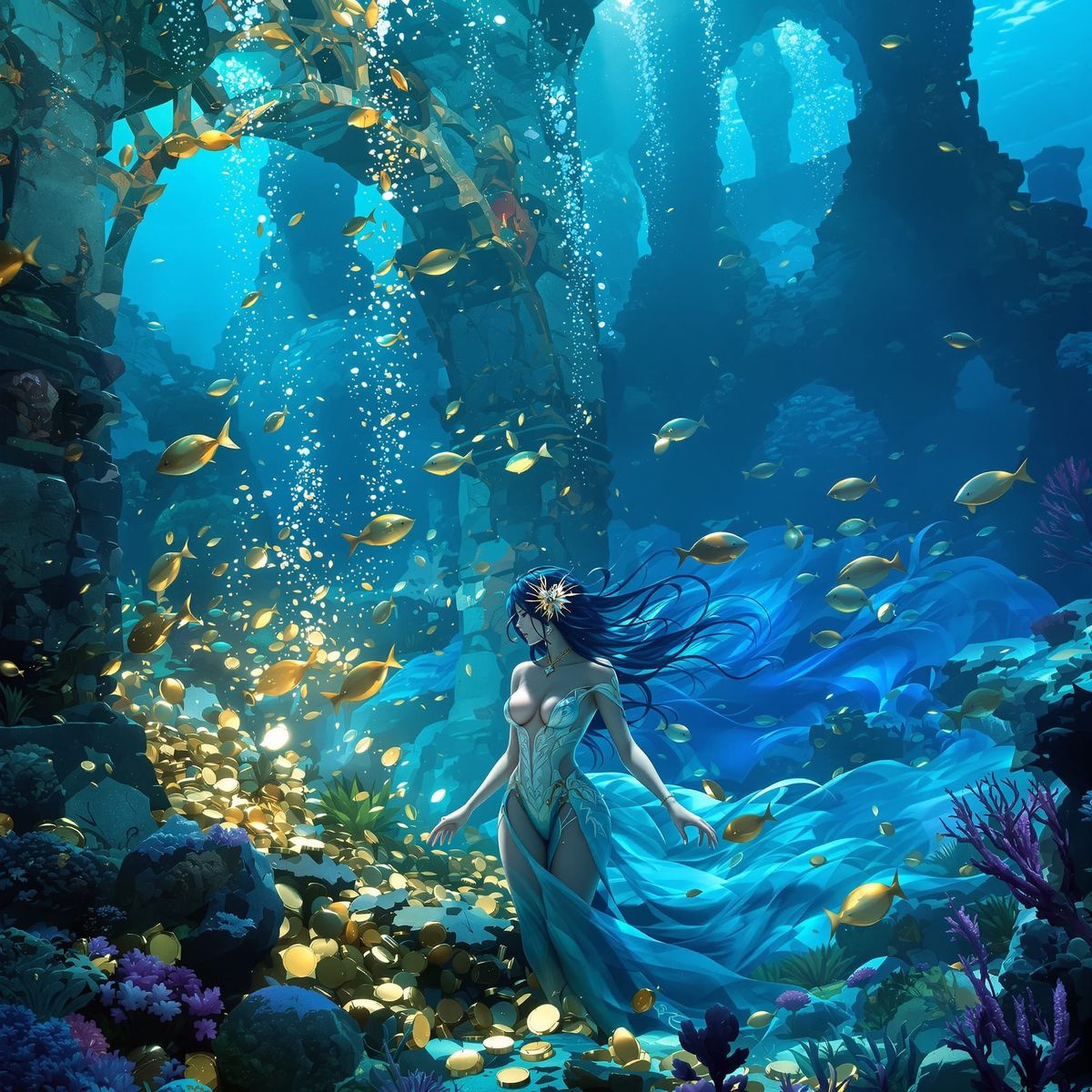 This image shows a mysterious woman in flowing attire discovering gold within sunken ruins. Rendered as 3D anime art, the scene features vibrant colors, intricate details, and breathtaking textures reminiscent of concept art.