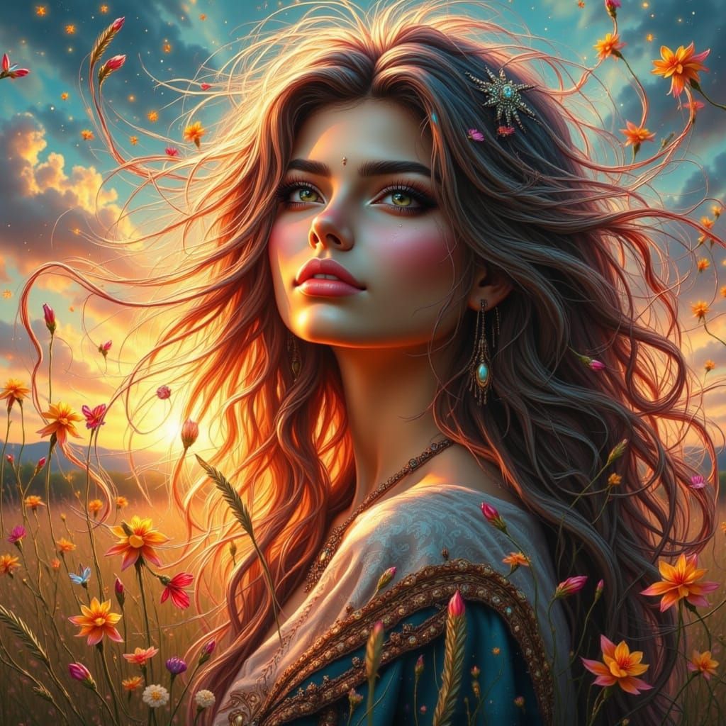 This hyperrealistic image captures a woman bathed in golden hour light, surrounded by wilted flowers. Concept art with intricate detail and a colorful background.