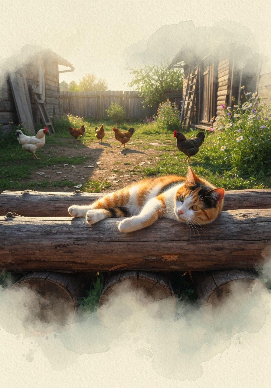 A detailed watercolor painting depicting a multi-colored cat resting on logs in a village yard. Chickens and flowers add to the rustic, atmospheric scene with soft, diffused lighting.