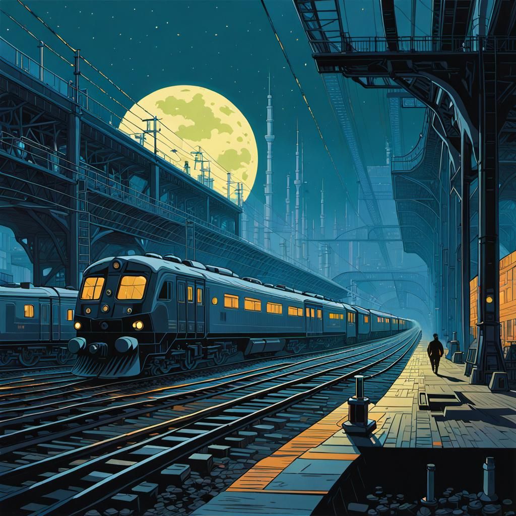 A dramatic image of a speeding night train cutting through the darkness. Giant structures loom over the railway in this sharp, high-resolution digital painting, reminiscent of Moebius's style.
