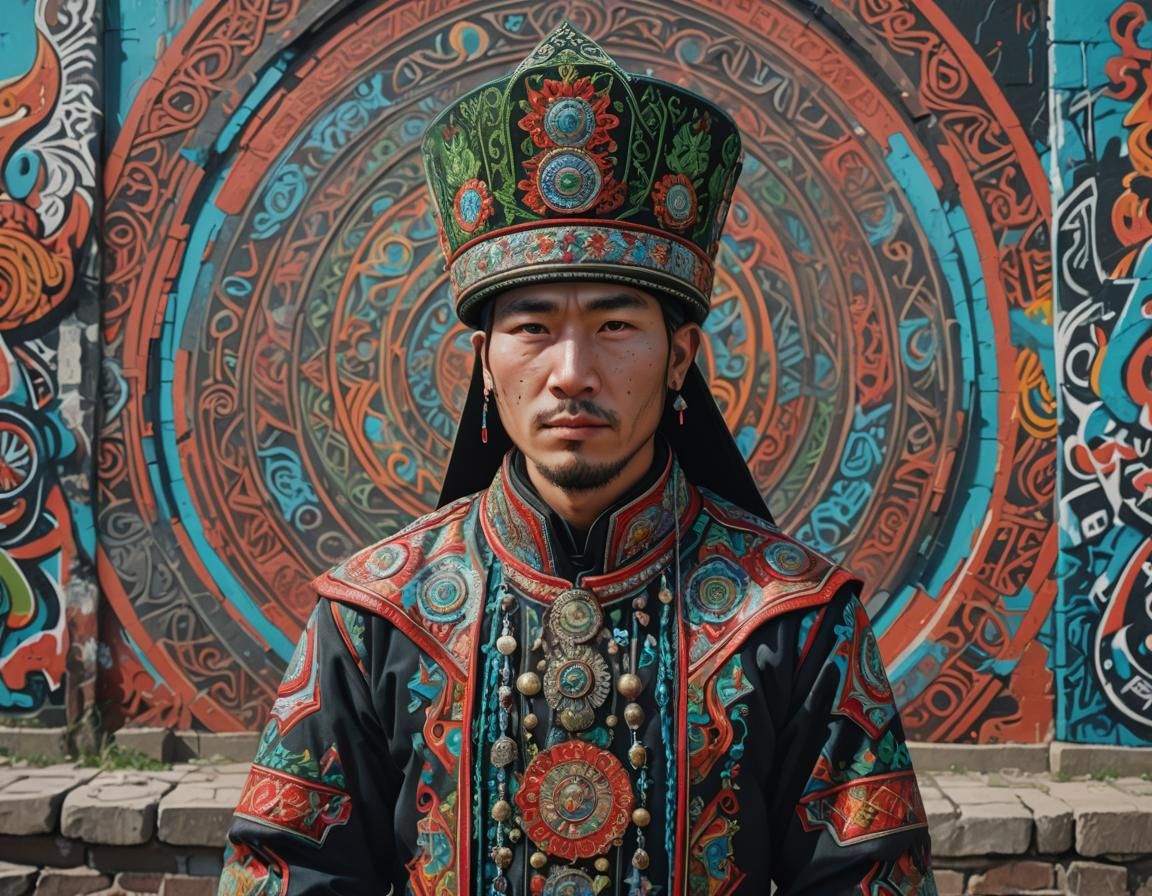 This image features a hyperrealistic rendering of Salavat Yulaev in national costume. The artwork showcases dynamic lighting and intricate details, set against a graffiti background. The piece is rendered with vibrant colors and acrylic textures.