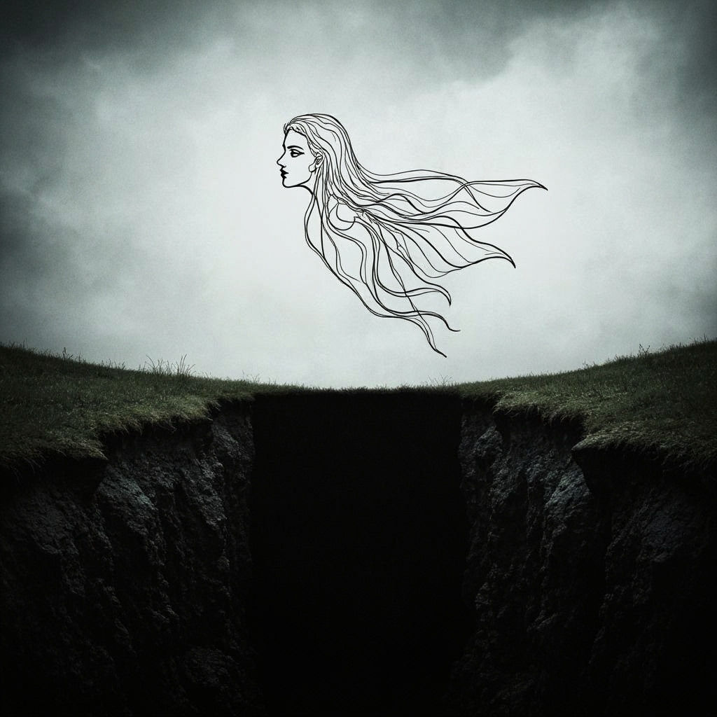 This image captures a harrowing scene of a peasant man on horseback leaping over a dark chasm, pursued by a terrifying fairy inspired by dark fantasy art and nightmare aesthetics.